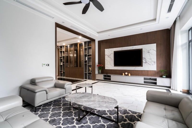 Đây là một công trình thi công hoàn thiện nội thất cho biệt thự 4 tầng tại Nghệ An. Phía đối diện bộ sofa bọc da hiện đại cao cấp là khu vực tivi. Để trang trí nội thất cho biệt thự này, Morehome sử dụng hai vật liệu là gỗ ốp tường và đá nhân tạo vân mây ốp tường.