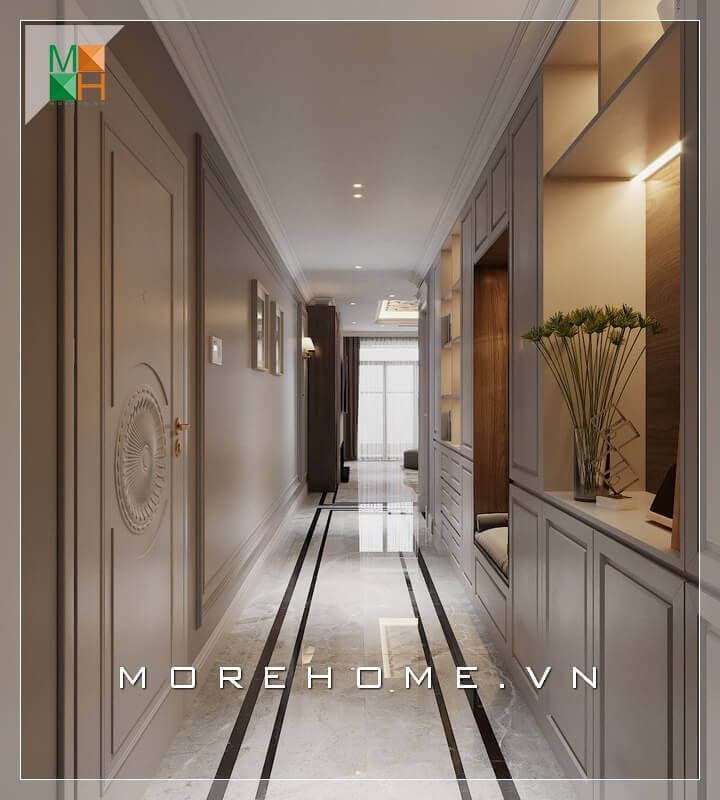 Lối thiết kế nội thất biệt thự, nhà phố. chung cư thông minh và tận dụng diện tích hành lang để thiết kế kệ tủ đồ gỗ cao cấp âm tường hiện đại và sang trọng có tính thẩm mỹ cao.