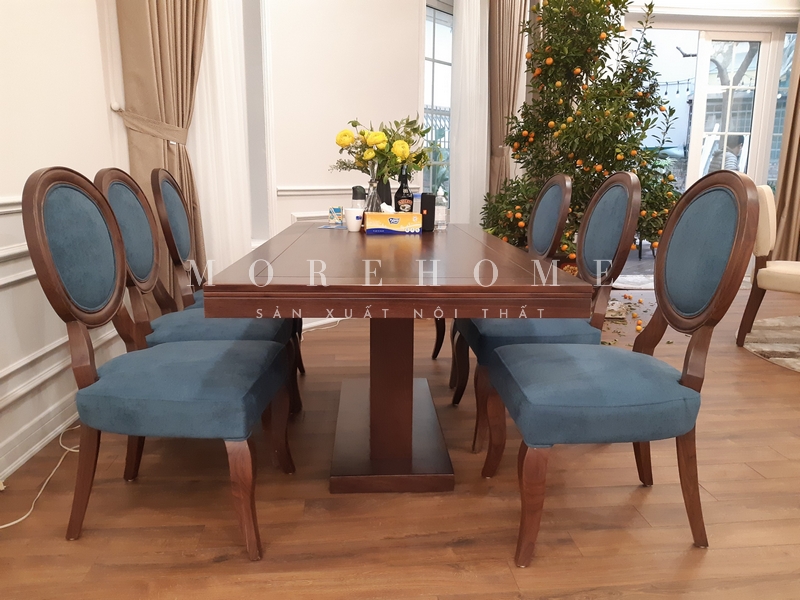 Thi công một bàn ăn hình chữ nhật có chân trụ giữa và diện tích bề mặt rộng rãi, 4 góc vuông tạo sự vuông vắn phù hợp với nhu cầu của gia đình có nhiều thành viên và có trẻ nhỏ. Bàn ăn được làm bằng gỗ tự nhiên.